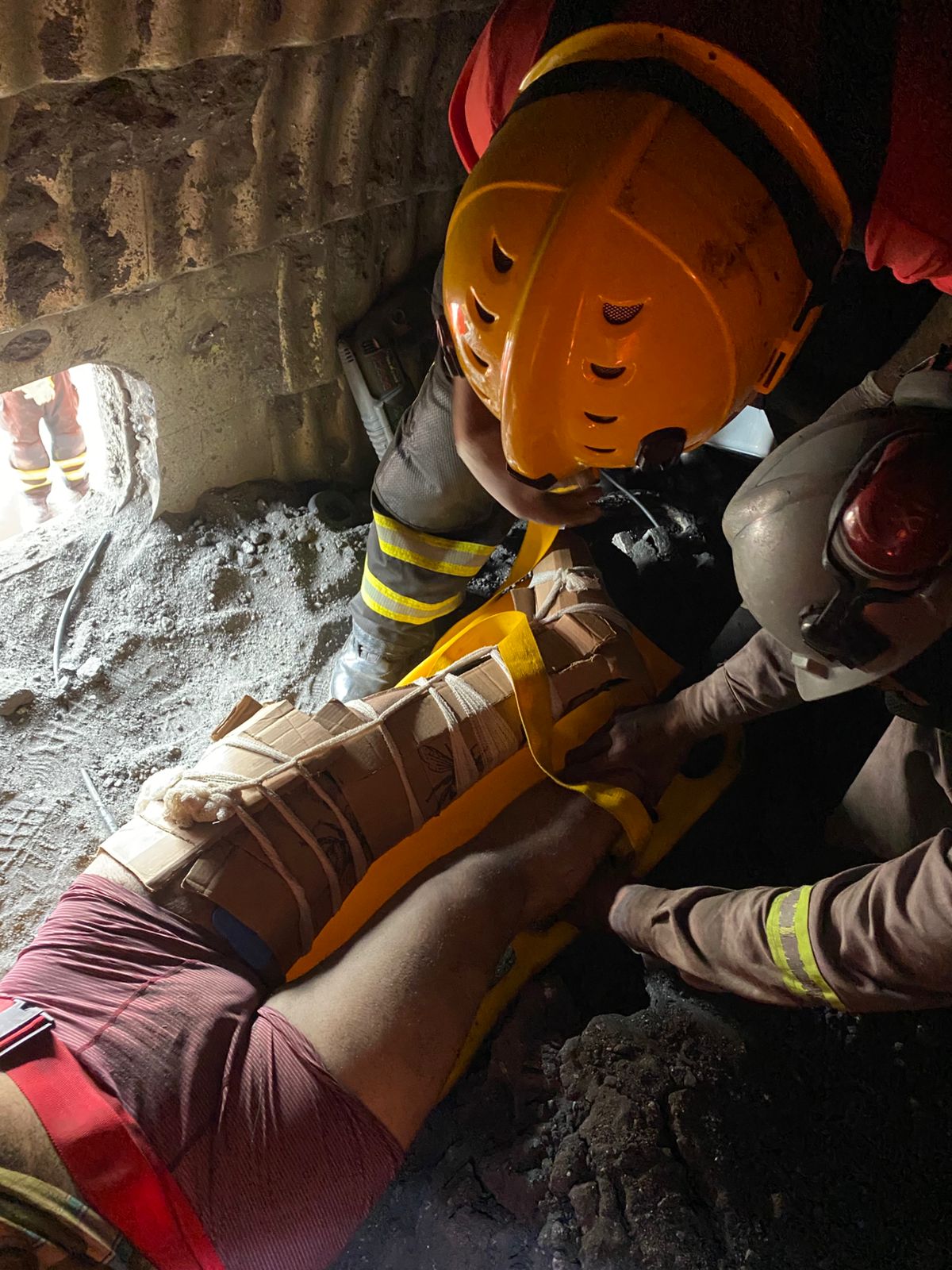 Um dos trabalhadores realizava a retirada de um material preso no equipamento, quando, de forma inesperada, o objeto se desprendeu e caiu sobre ele, provocando uma possível fratura no fêmur.