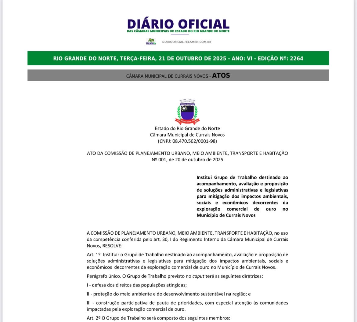 Foi publicado no Diário Oficial das Câmaras Municipais do Estado do Rio Grande do Norte o Ato da Comissão de Planejamento Urbano, Meio Ambiente, Transporte e Habitação da Câmara Municipal de Currais Novos, que institui um Grupo de Trabalho (GT) para acompanhar, avaliar e propor soluções administrativas e legislativas para mitigar os impactos ambientais, sociais e econômicos decorrentes da exploração comercial de ouro no município.