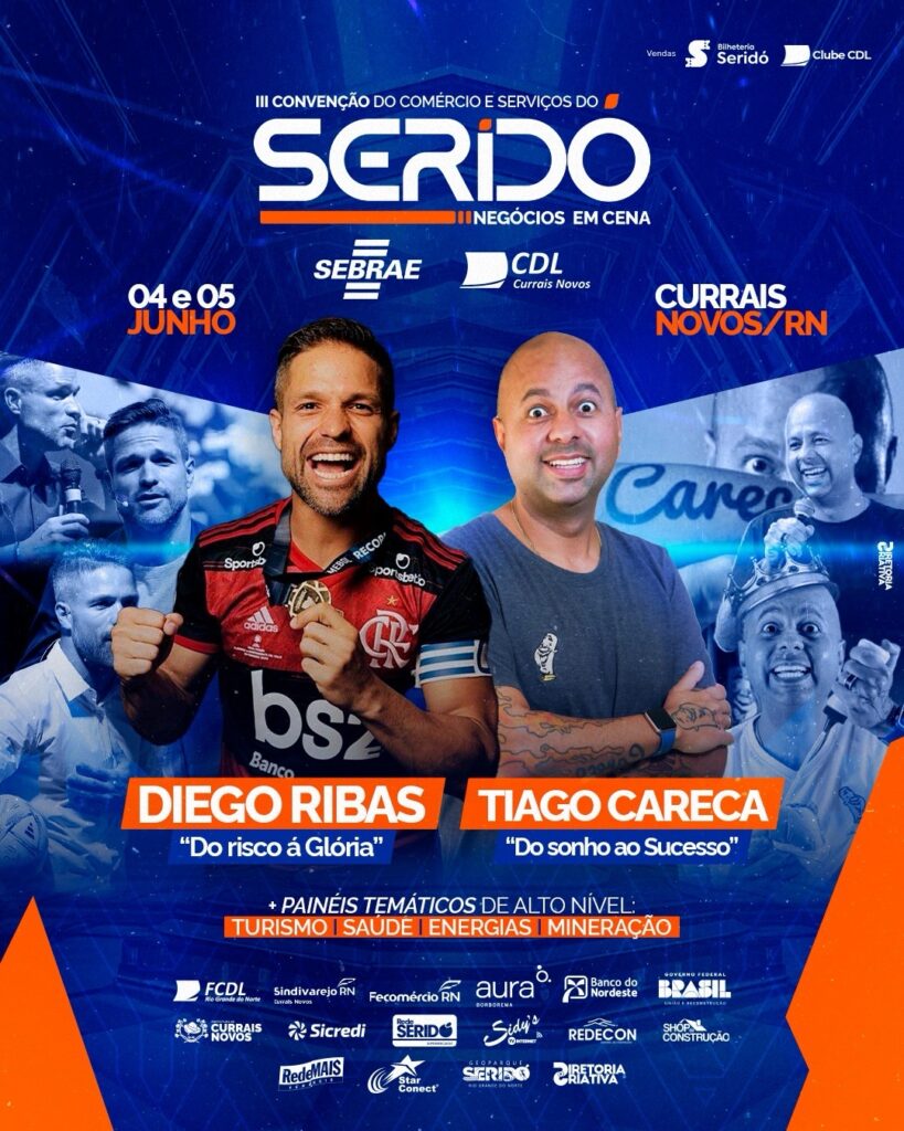 É hoje! A CDL Currais Novos e o Sebrae realizam a partir desta quarta-feira (4) a III Convenção do Comércio e Serviços do Seridó – Negócios em Cena no Teatro Ubirajara Galvão. O evento é voltado para empreendedores e terá a presença de nomes de renome nacional como o ídolo do Flamengo, Diego Ribas, que se apresenta nesta quarta, e Tiago Careca, empresário e referência nacional, que sobe no palco na quinta.
