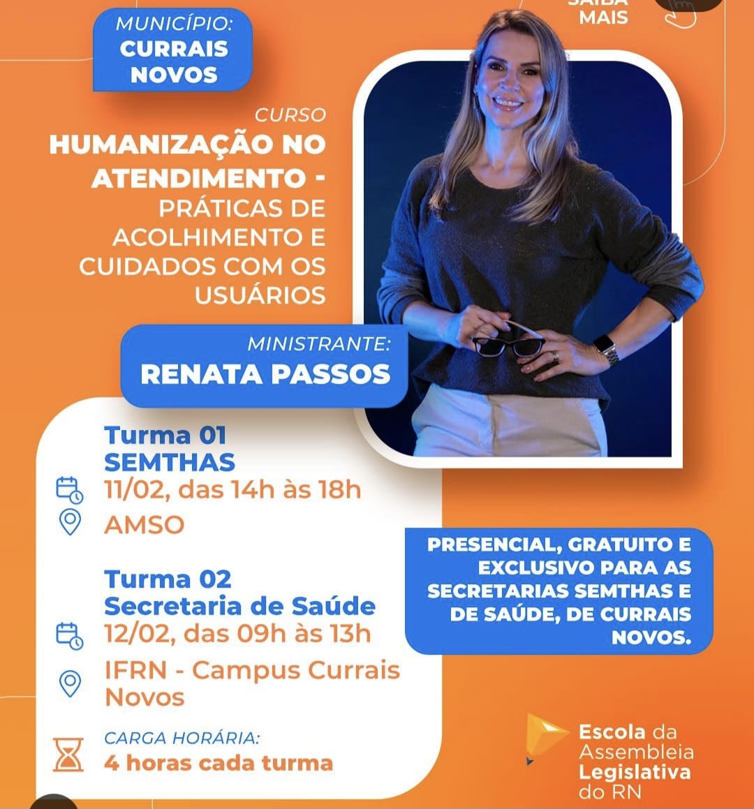 A Escola da Assembleia Legislativa do Rio Grande do Norte (EALRN) realizará, nos dias 11 e 12 de fevereiro, em Currais Novos, um curso exclusivo sobre Humanização no Atendimento. A qualificação é voltada para os servidores da Secretaria Municipal do Trabalho, Habitação e Assistência Social (SEMTHAS) e da Secretaria de Saúde e foi solicitada pela vice-prefeita Milena Galvão. Cerca de 200 servidores municipais serão beneficiados ao longo dos dois dias de evento.
