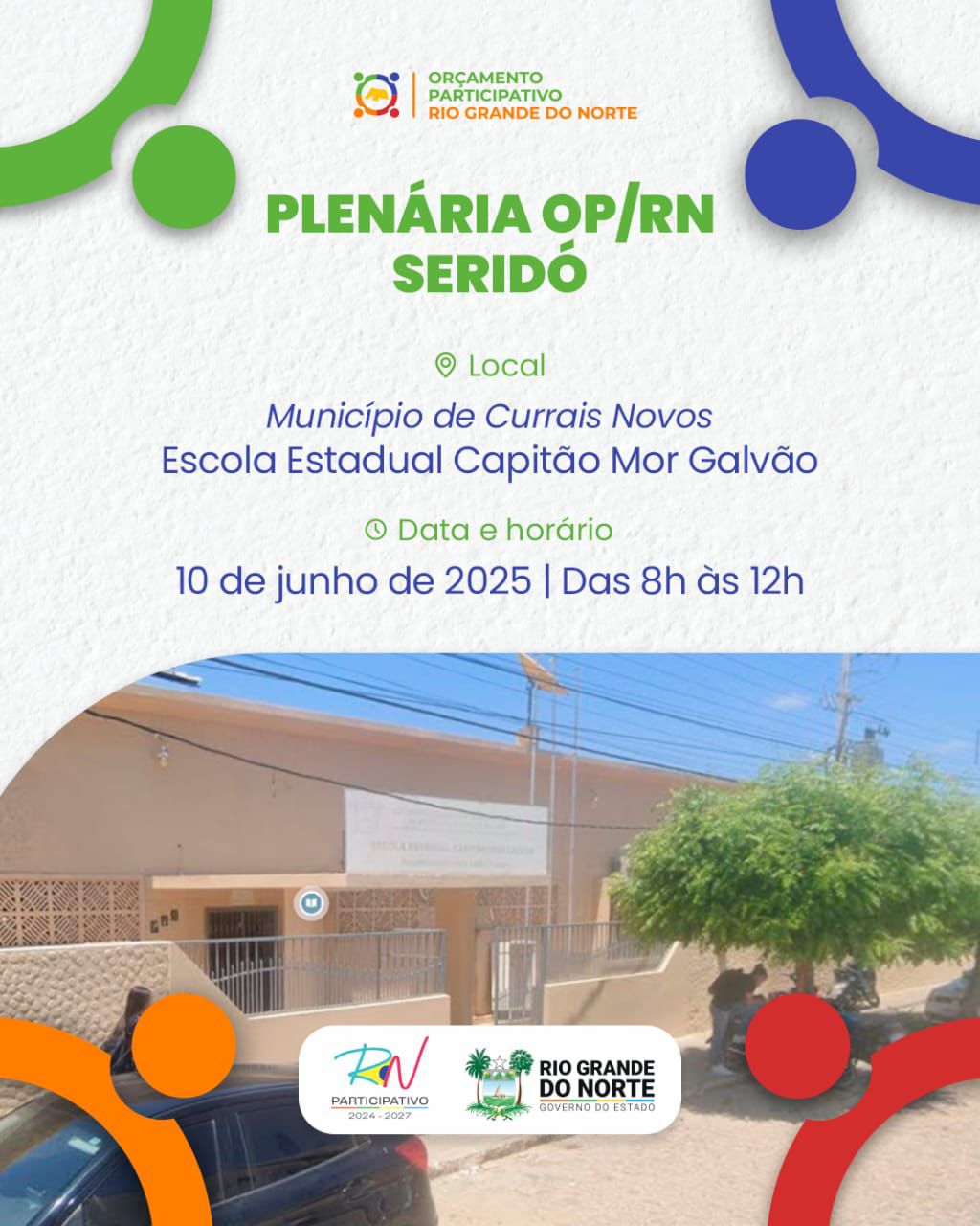 O Governo do Estado do Rio Grande do Norte realiza nesta terça-feira, 10 de junho de 2025, a Plenária do Orçamento Participativo (OP/RN) da região Seridó. O encontro acontecerá das 8h às 12h, na Escola Estadual Capitão Mor Galvão, no município de Currais Novos.