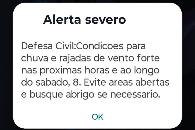 A Defesa Civil de São Paulo emitiu, por volta das 19h40 desta sexta-feira (7), um alerta severo de risco de chuva e rajadas de vento fortes nas próximas horas e durante o sábado.