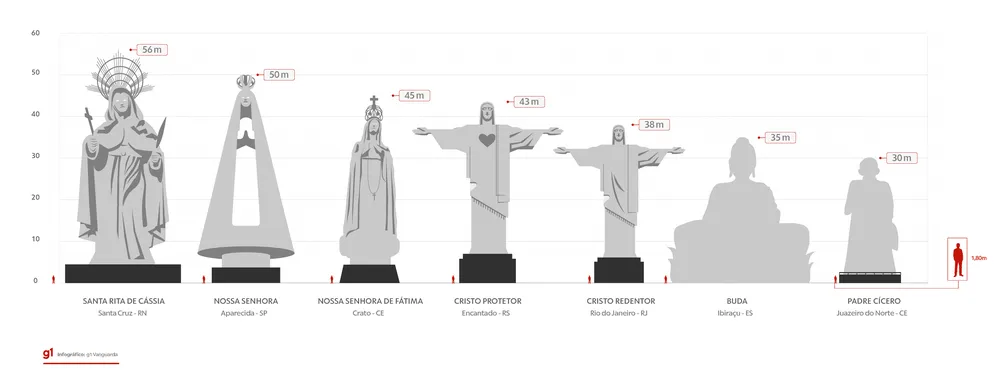 A estátua é maior, por exemplo, do que a do Cristo Redentor, no Rio de Janeiro (RJ), que tem 38 metros, e do que a de Nossa Senhora Aparecida, em Aparecida (SP), que tem 50 metros.