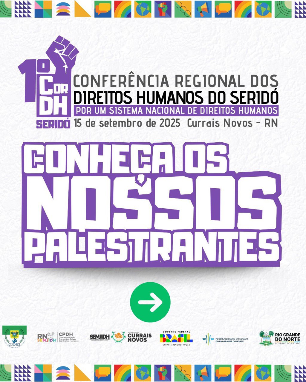 Nesta segunda-feira (15) , acontece a 1ª Conferência Regional de Direitos Humanos do Seridó, que acontecerá no Teatro Municipal Ubirajara Galvão. O evento integra a etapa preparatória rumo à 8ª Conferência Estadual de Direitos Humanos e à 13ª Conferência Nacional de Direitos Humanos, com o tema: “Por um Sistema Nacional de Direitos Humanos: consolidar a democracia, resistir aos retrocessos e avançar na garantia de direitos para todas as pessoas”. A conferência será um marco para a região, reunindo representantes de instituições, movimentos sociais e da sociedade civil, e contará com palestrantes de destaque que atuam em diferentes frentes de defesa dos direitos humanos.