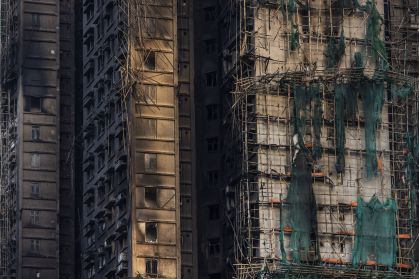 No momento do incidente, o Wang Fuk Court passava por reformas, e todas as torres estavam cobertas por andaimes de bambu e telas verdes de proteção.