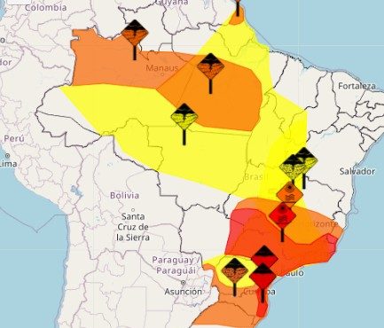 Além disso, há quatro alertas laranja para tempestades e chuvas intensas. Um deles atinge o norte do Rio Grande do Sul, Santa Catarina, sul e litoral do Paraná, e extremos sul do Mato Grosso do Sul e de São Paulo, onde a previsão é de chuva entre 30 e 60 mm/h ou 50 a 100 mm/dia, com risco de ventos fortes entre 60 e 100 km/h e até queda de granizo.
