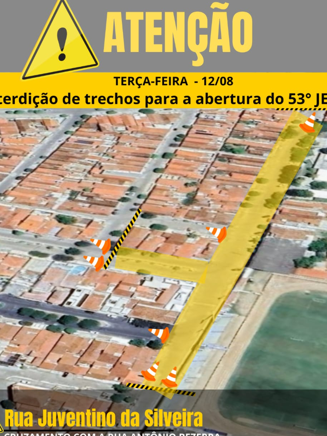 A Secretaria Municipal de Trânsito e Transporte anunciou que haverá interdição temporária de vias em Currais Novos nesta terça-feira, 12 de agosto, a partir das 15h, em razão da solenidade de abertura da 53ª edição dos Jogos Escolares do Rio Grande do Norte (JERNS).