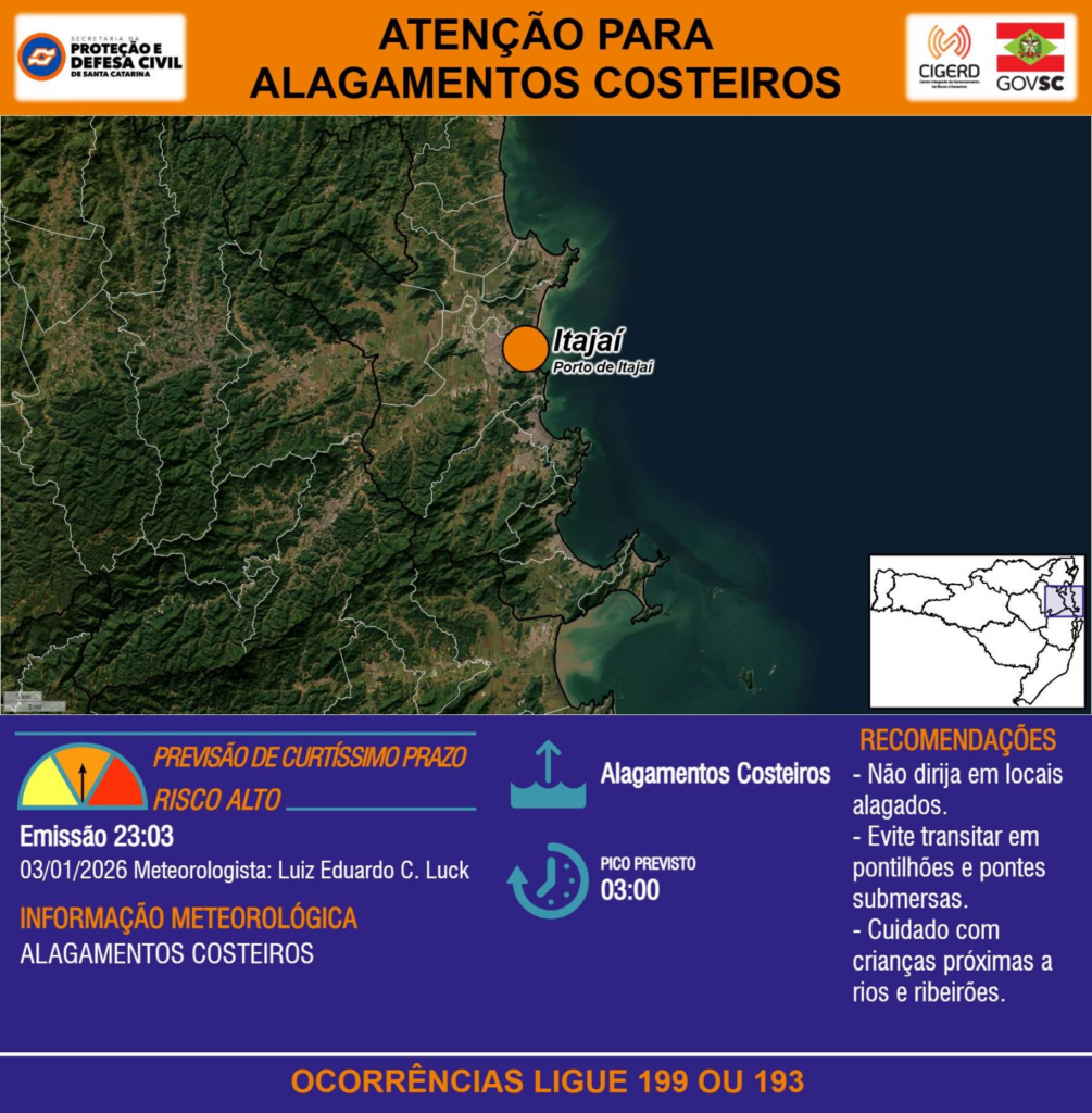 A Secretaria da Proteção e Defesa Civil de Santa Catarina alerta para alagamentos costeiros no município de Itajaí nas próximas horas devido à maré alta, com pico previsto para às 03:00 horas.
