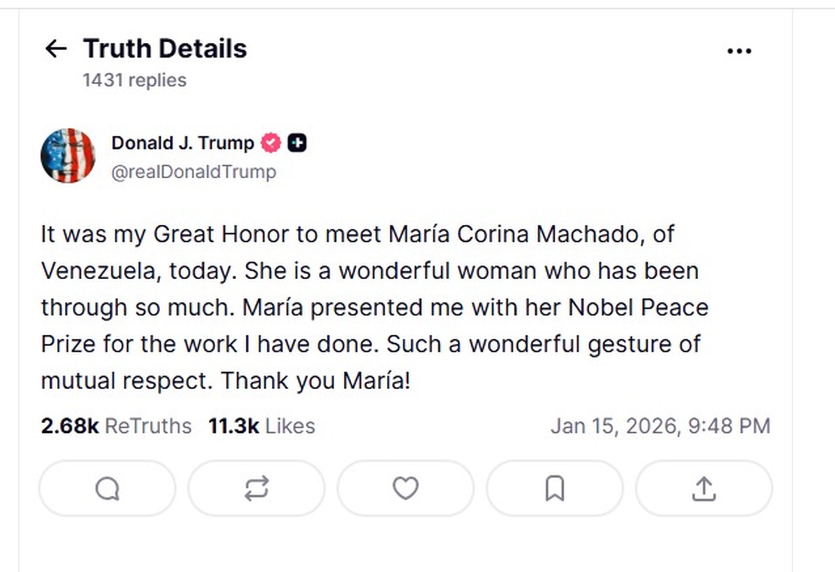 Segundo um funcionário da Casa Branca, Trump pretende ficar com a medalha. Em uma postagem nas redes sociais na noite de quinta, Trump afirmou que María o presenteou com o Nobel pelo trabalho que ele realizou, descrevendo o gesto como uma demonstração maravilhosa de respeito mútuo.