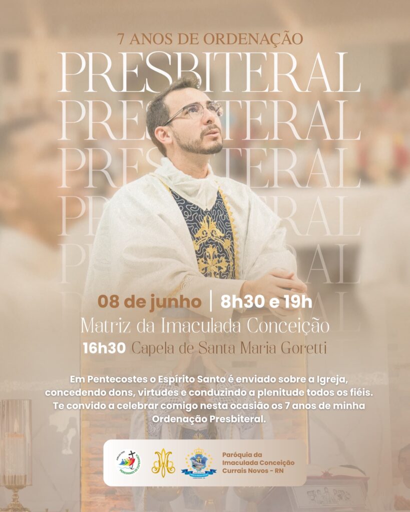 Neste sábado (8) de junho, o padre Fagner Dantas, pároco da Paróquia da Imaculada Conceição, em Currais Novos, celebrará um momento especial de sua caminhada: os 7 anos de sua ordenação presbiteral. A data será marcada por missas em dois horários na igreja Matriz que ele comanda, às 8h30 e às 19h, e também com uma celebração na Capela de Santa Maria Goretti, às 16h30.