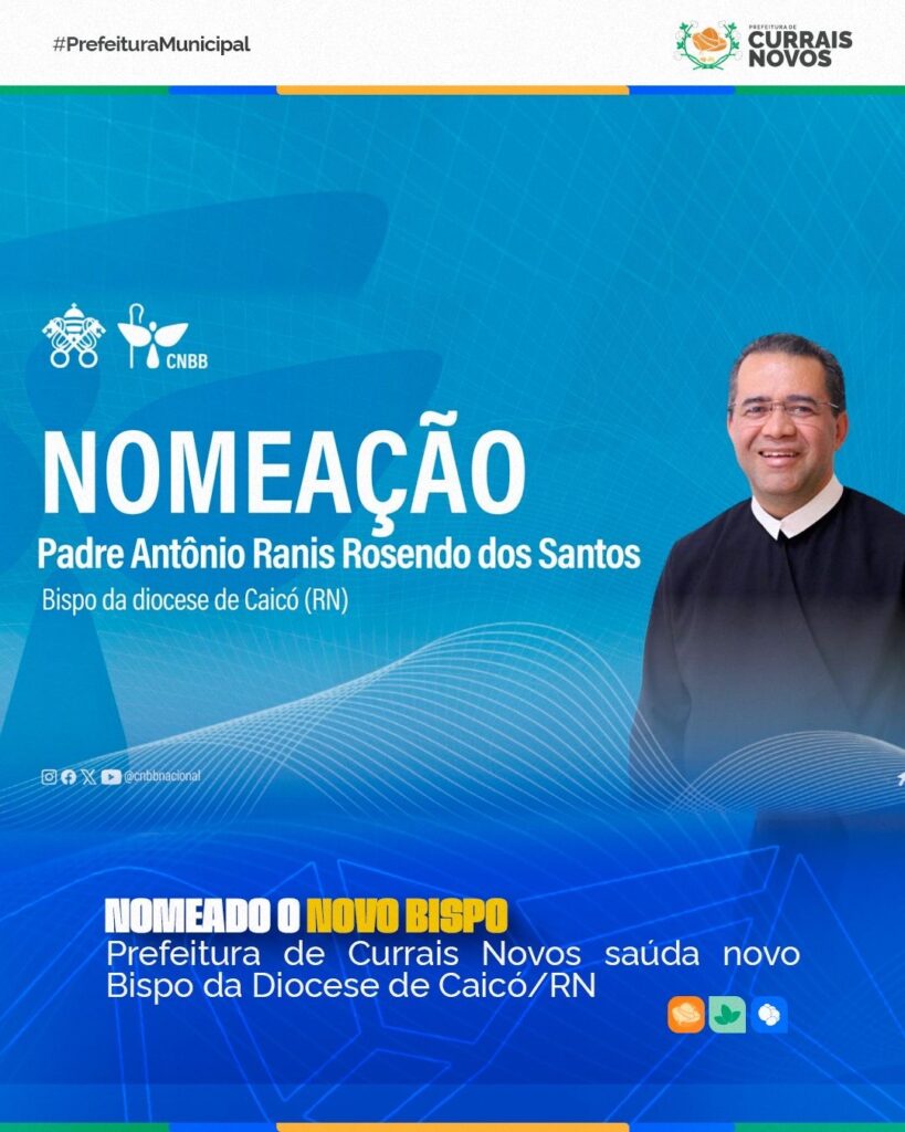 A Prefeitura de Currais Novos parabeniza o Padre Antônio Ranis Rosendo dos Santos, nomeado nesta sexta-feira (14) pelo Papa Francisco como novo Bispo da Diocese de Caicó.