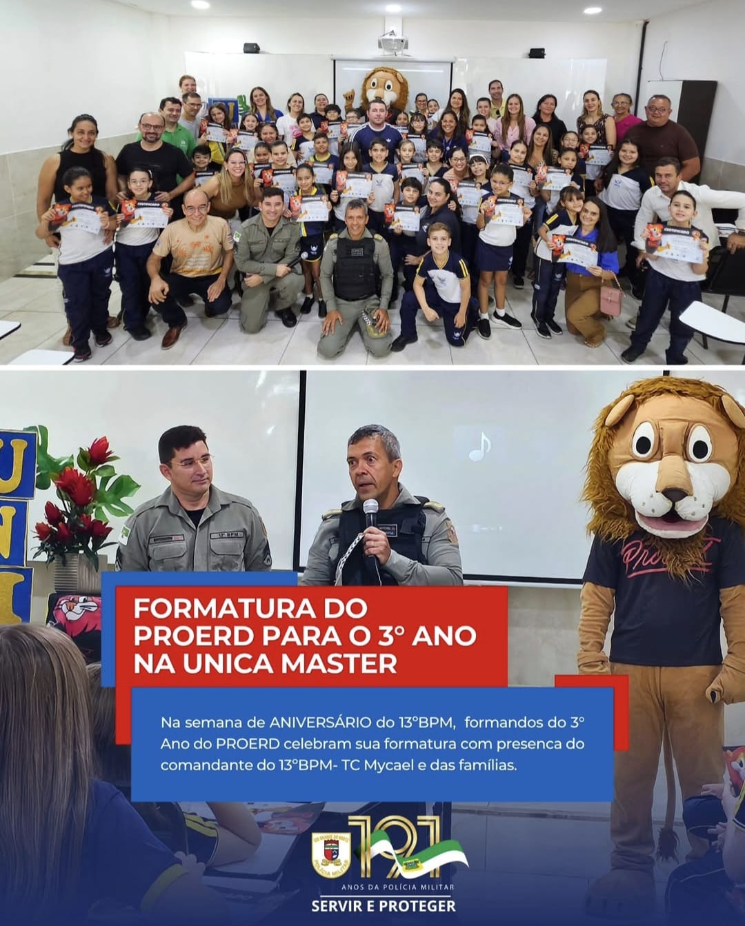 Em uma manhã marcada por emoção e aprendizado nesta última terça-feira (14), o 13º Batalhão de Polícia Militar realizou a formatura do PROERD – Programa Educacional de Resistência às Drogas e à Violência, destinada ao currículo do 3º ano do Ensino Fundamental da Escola UNICA Master.