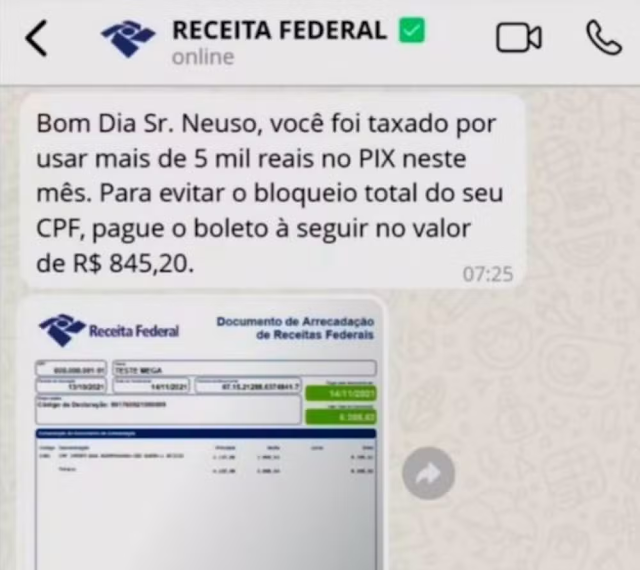 Criminosos estão abordando possíveis vítimas dizendo que há uma suposta cobrança de taxas pela Receita Federal sobre transações via PIX em valores acima de R$ 5 mil e, por isso, pedem que um boleto seja pago.