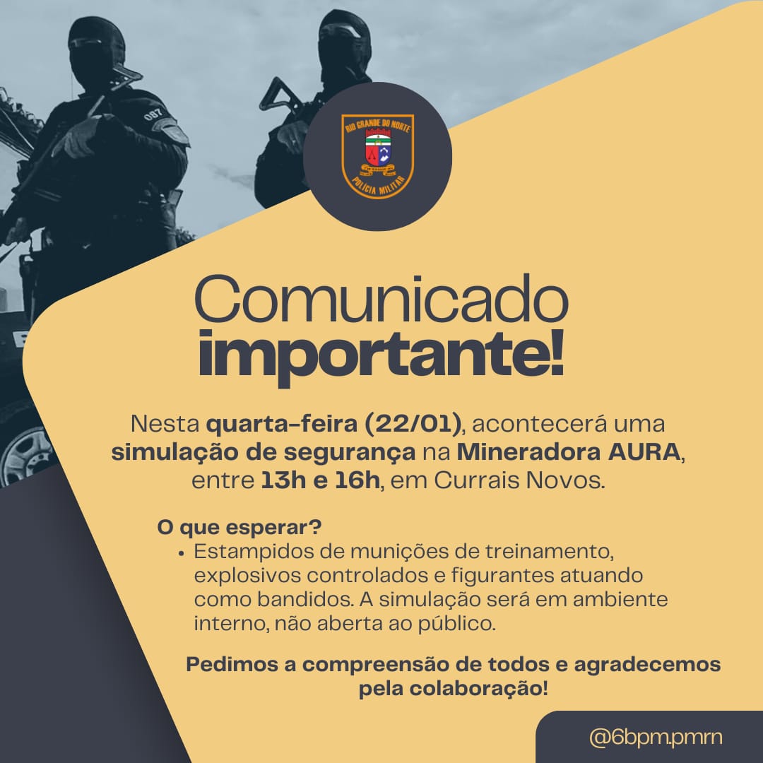 Nesta quarta-feira (22), a Mineradora AURA, em Currais Novos, será palco de uma simulação do Plano de Defesa, coordenada pelo Major Valdez. O treinamento está programado para ocorrer das 13h às 16h e envolverá diversos elementos realistas, como o uso de munições de treinamento, explosivos controlados e figurantes representando bandidos.