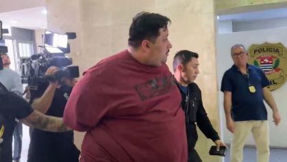 Um vídeo divulgado pela Polícia Civil de São Paulo registra o momento em que “Fofão” chega à delegacia, vestindo uma camiseta vermelha e bermuda verde.